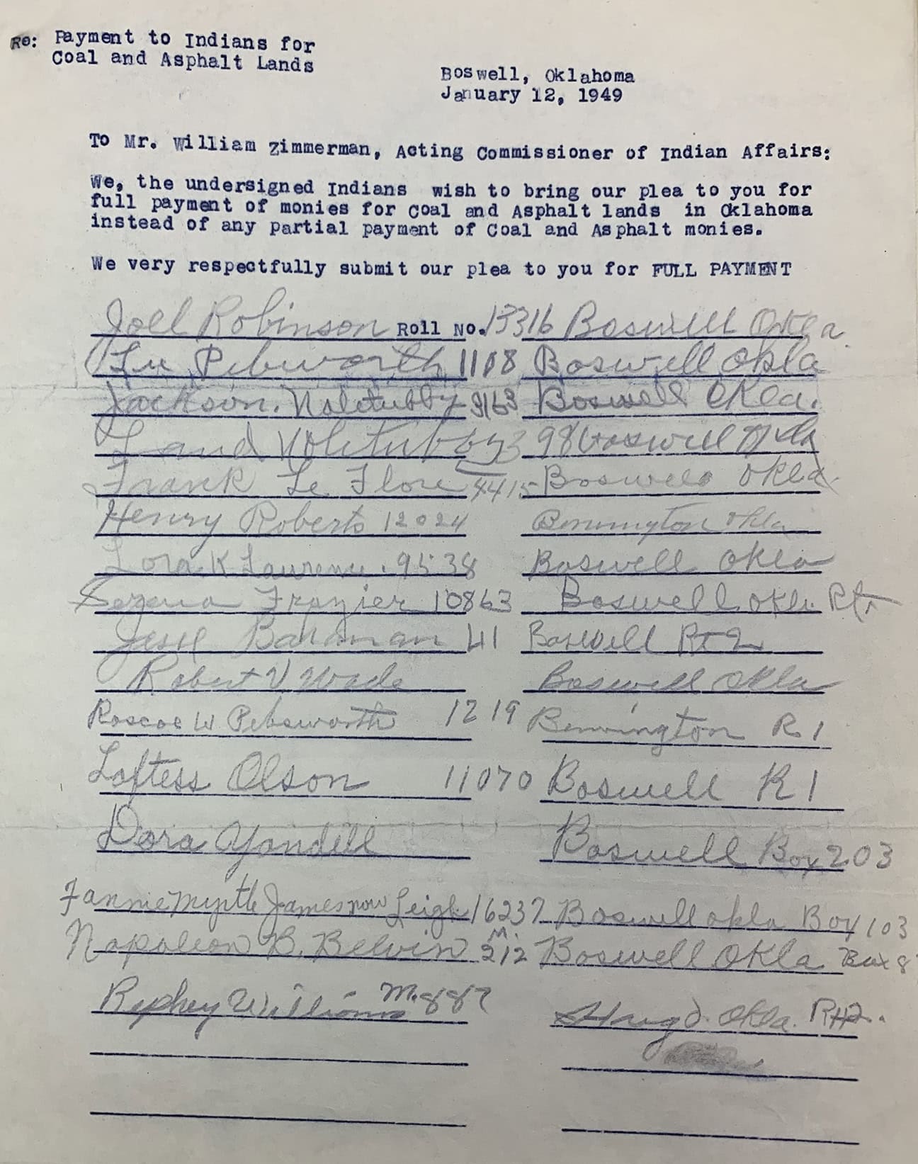 Petition by Choctaw community members in Boswell regarding coal and asphalt payments sent to the Acting Commissioner of Indian Affairs.